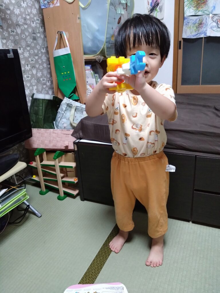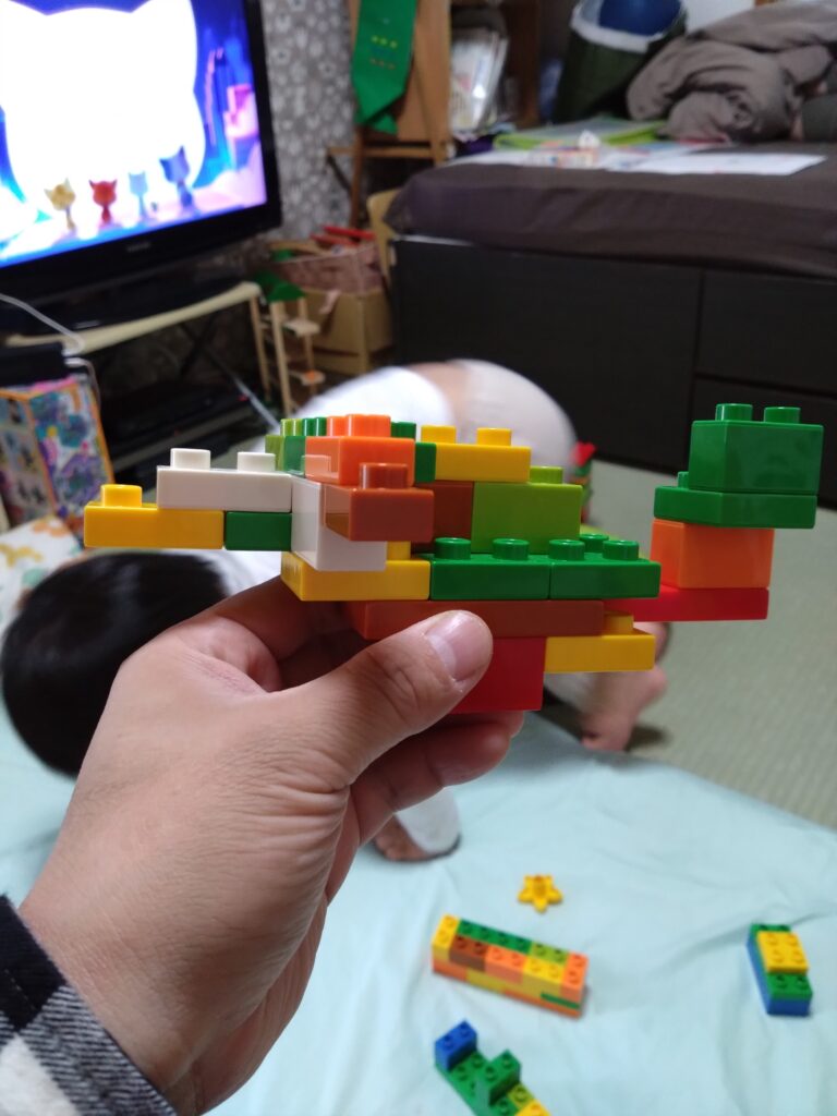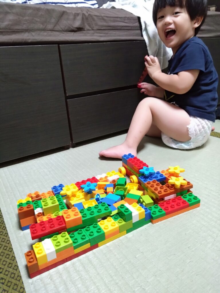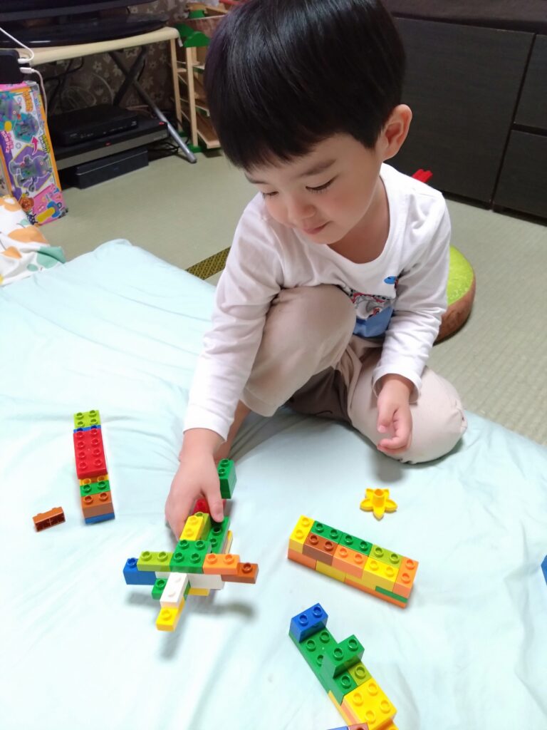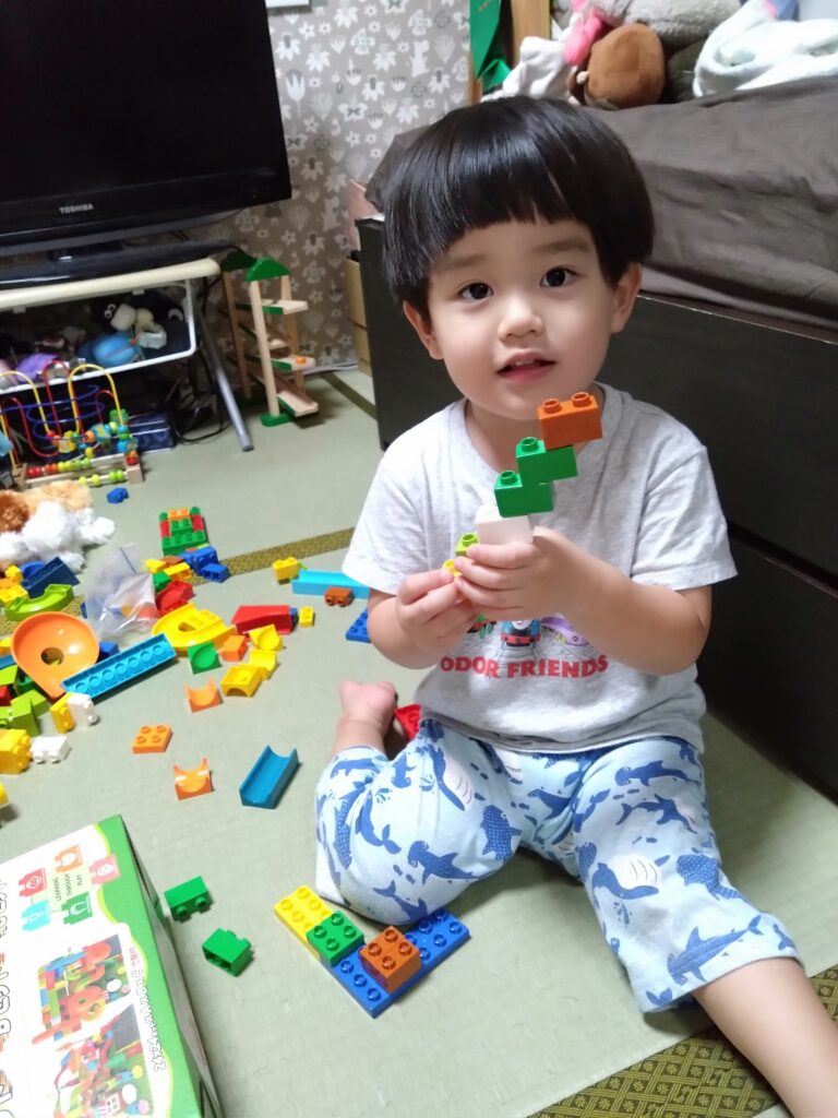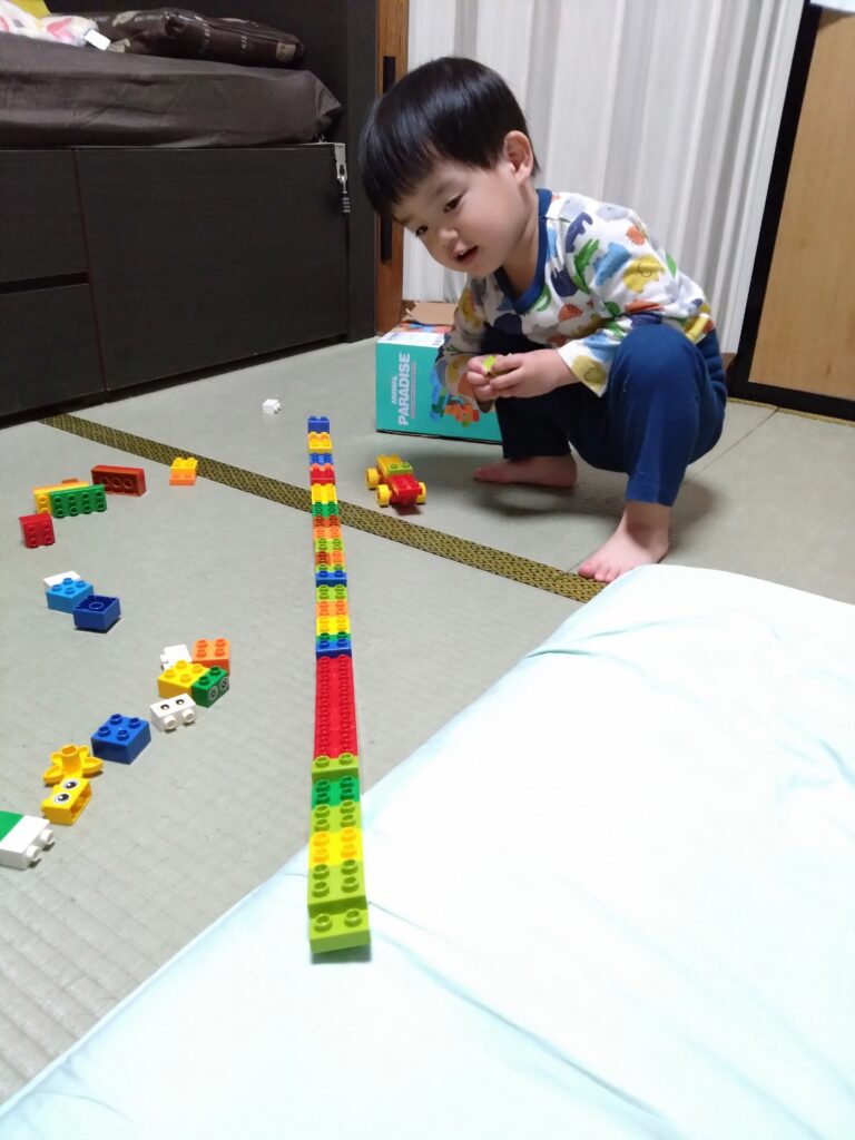 お風呂上がりに、久しぶりにデュプロのブロックで遊びました。