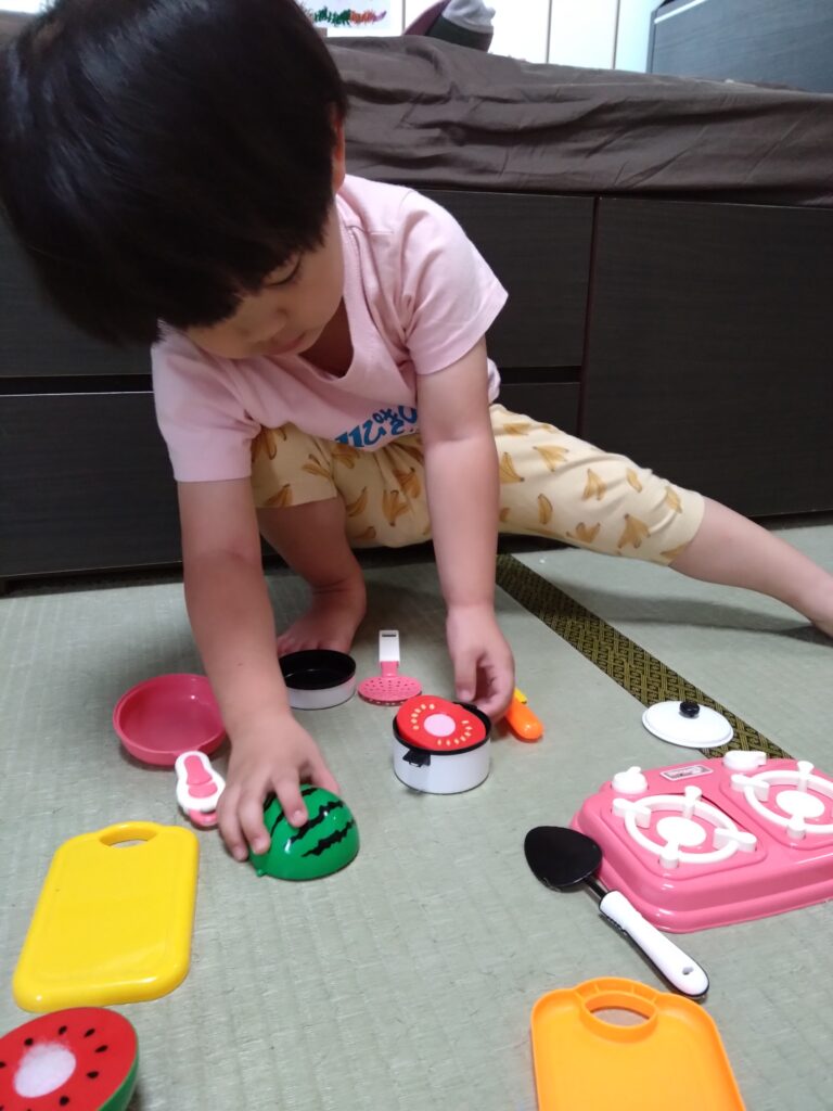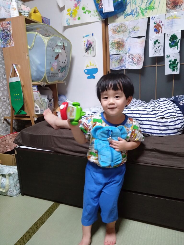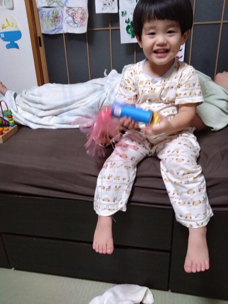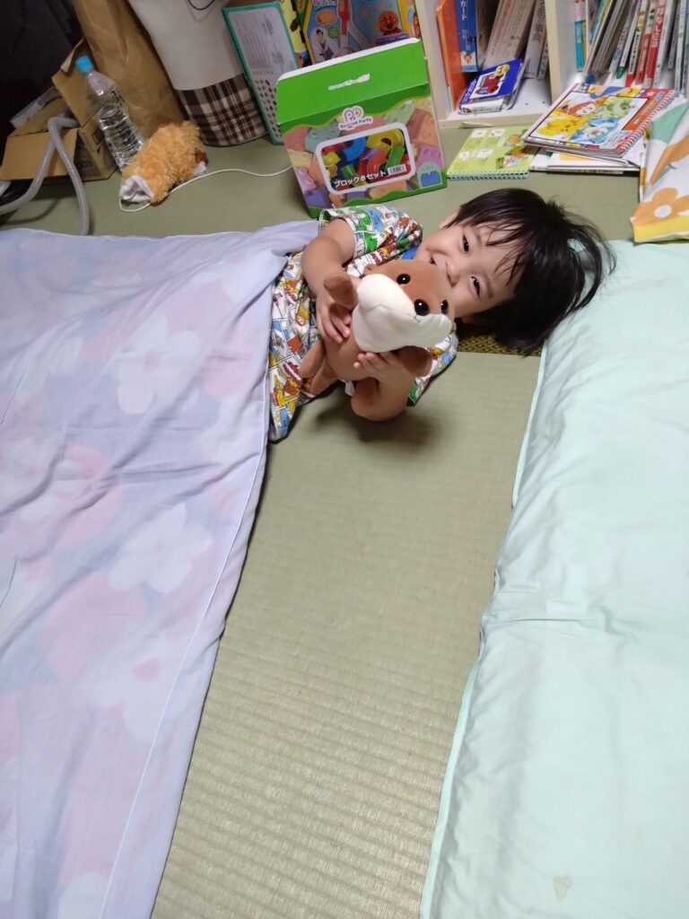 寝かしつけで、苦戦継続中。何故か本の読み聞かせをした後に、布団から出て暴れたりするように。エアコンの設定温度を26.5℃から2度下げて、風量もパワフルにして、クールダウンする作戦を実施中。少しは効果あるかな?