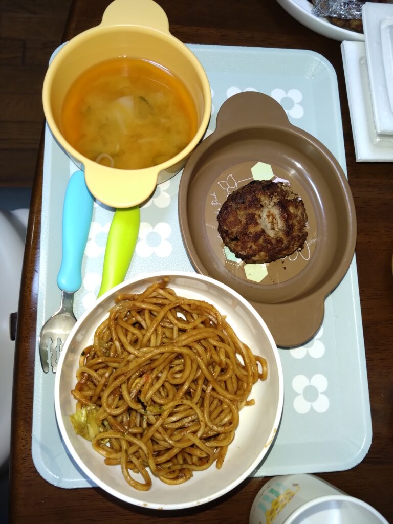 晩ご飯のお好み焼きもパクパク食べてた友李くん。ソースをかけたら、やっぱりソースしか舐めなくなって、ついにはスプーンを思いっきり投げる始末。