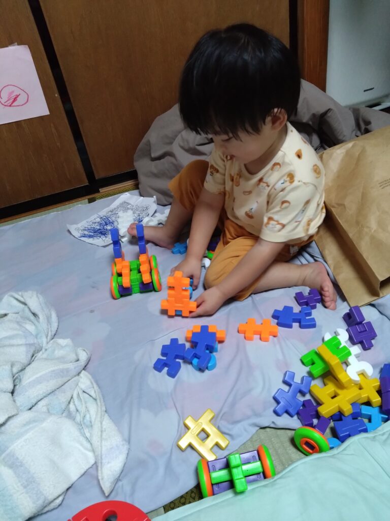 お風呂の後に、ゲームがしたいと言うので、久しぶりにブロックを勧めてみる(˶ᐢᗜᐢ˶)