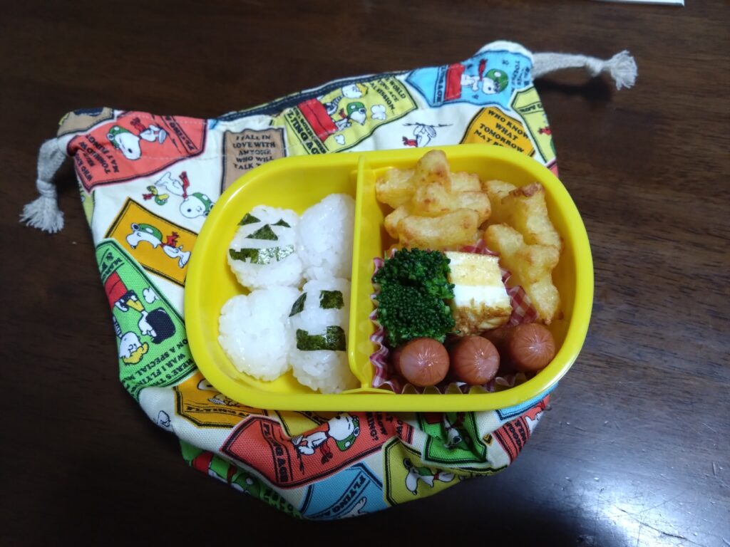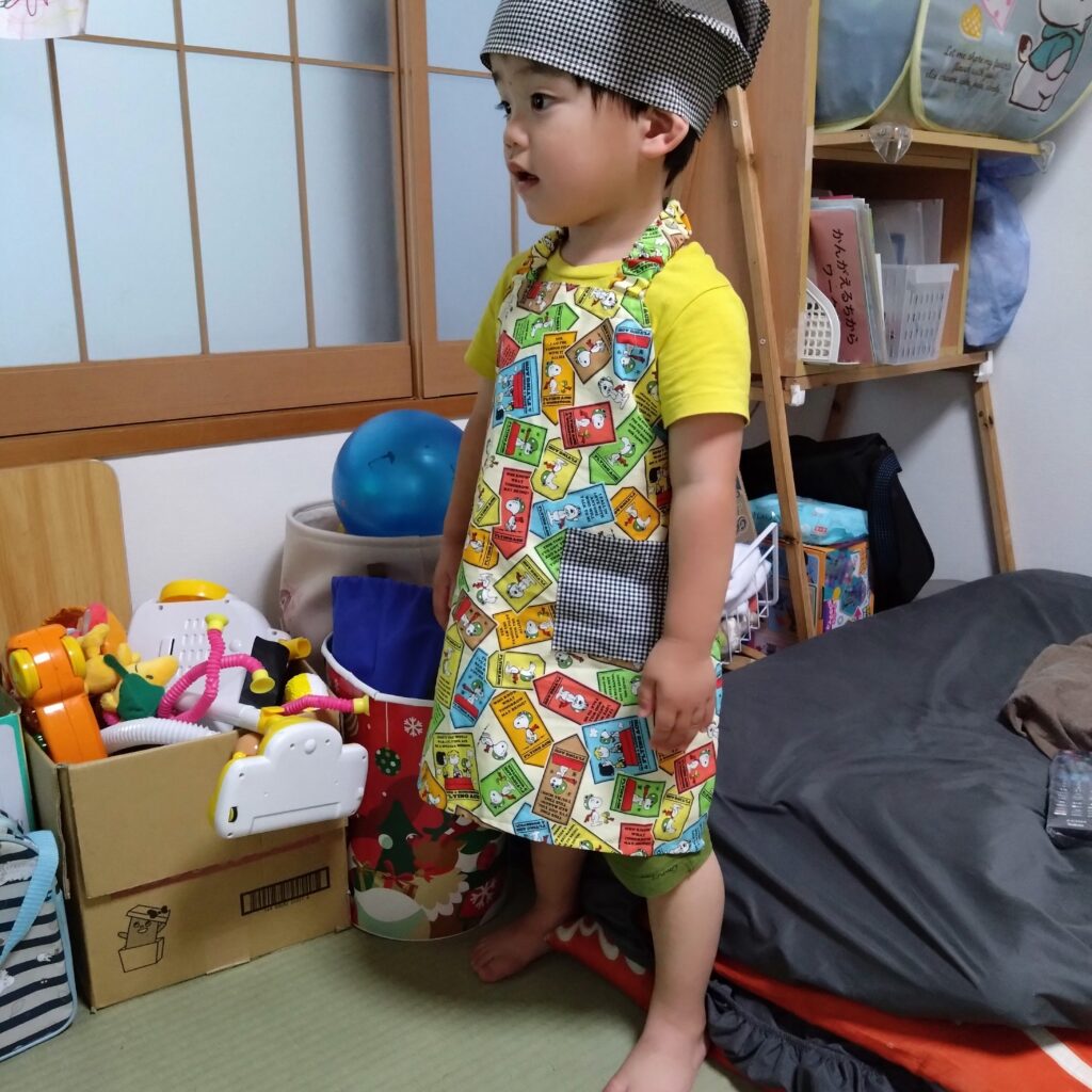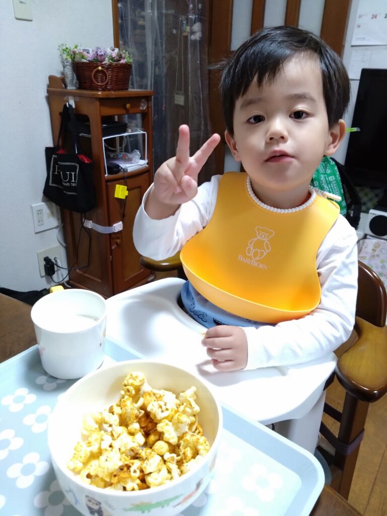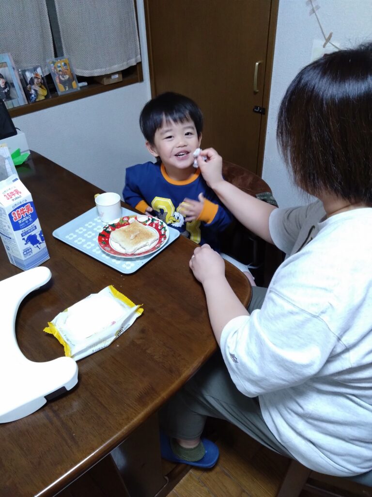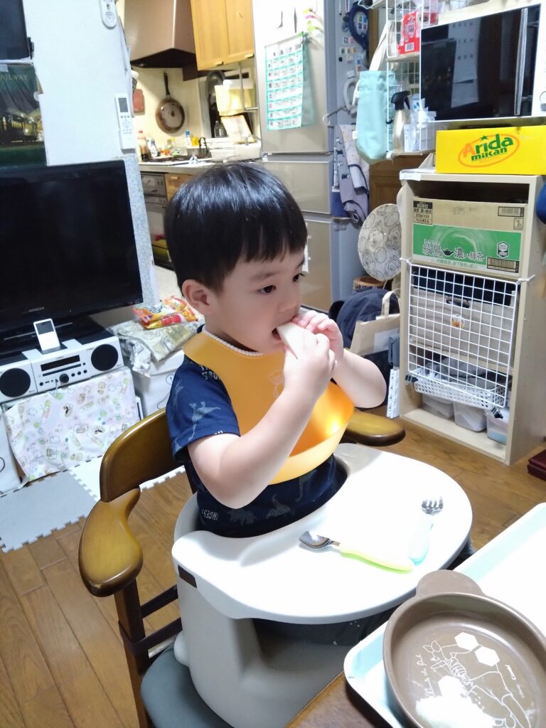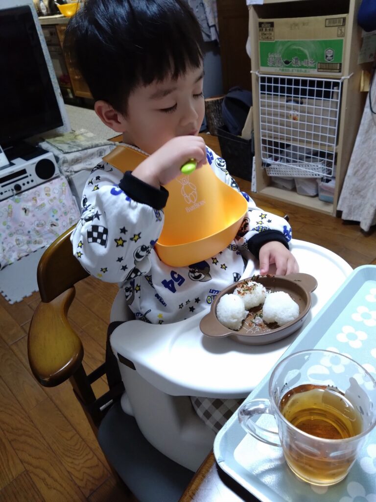 早めの夕ご飯で、豚のそぼろご飯を完食した友李くん。栄養補給にりんごと野菜のジュースも飲んでもらって、ヌーヌーでは、おっとっとを一袋(二袋入り)食べてもらいました。