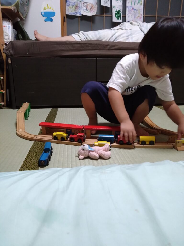 久しぶりに紐レールで電車ごっこ。本当に電車が好きみたいです(*´>ω<`*)