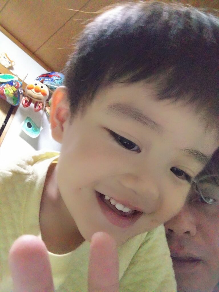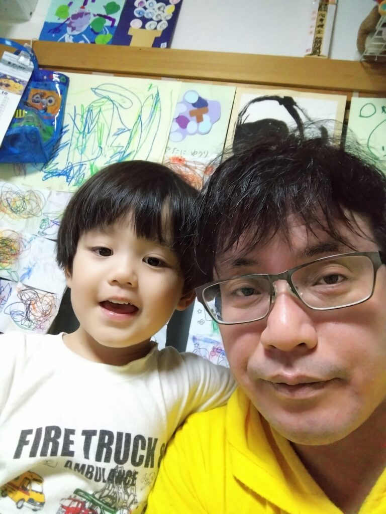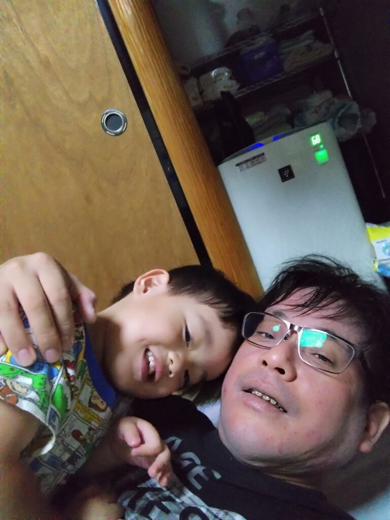 お風呂上がりに撮影。1枚目パパホラー😱。友李くんは今のところ元気です。