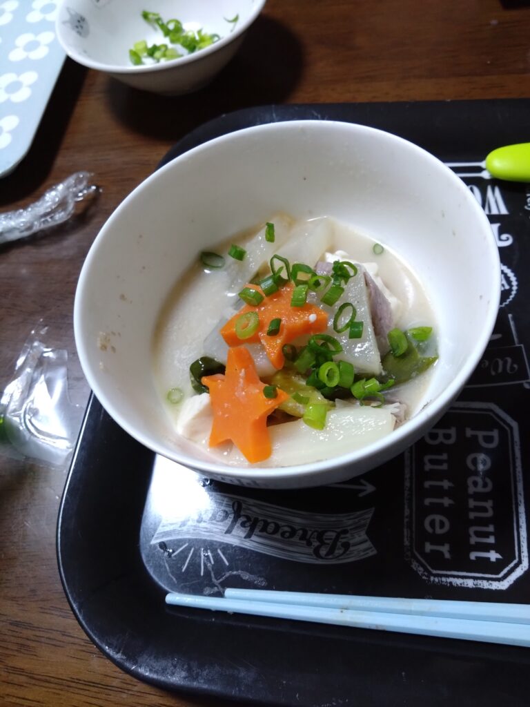 夜ご飯は、パパが味噌鍋を作りました!ママが食べすぎて、エノキが食堂に詰まって、吐きそうになってて、それが不謹慎だけどツボって笑ってしまいました🤣。