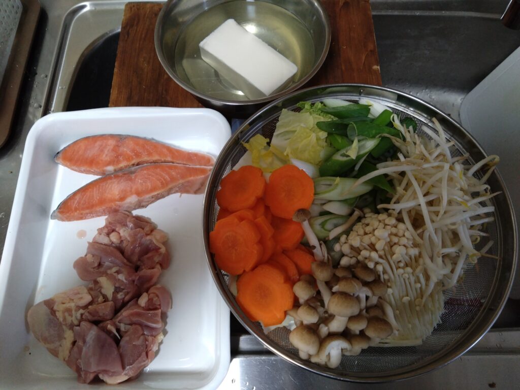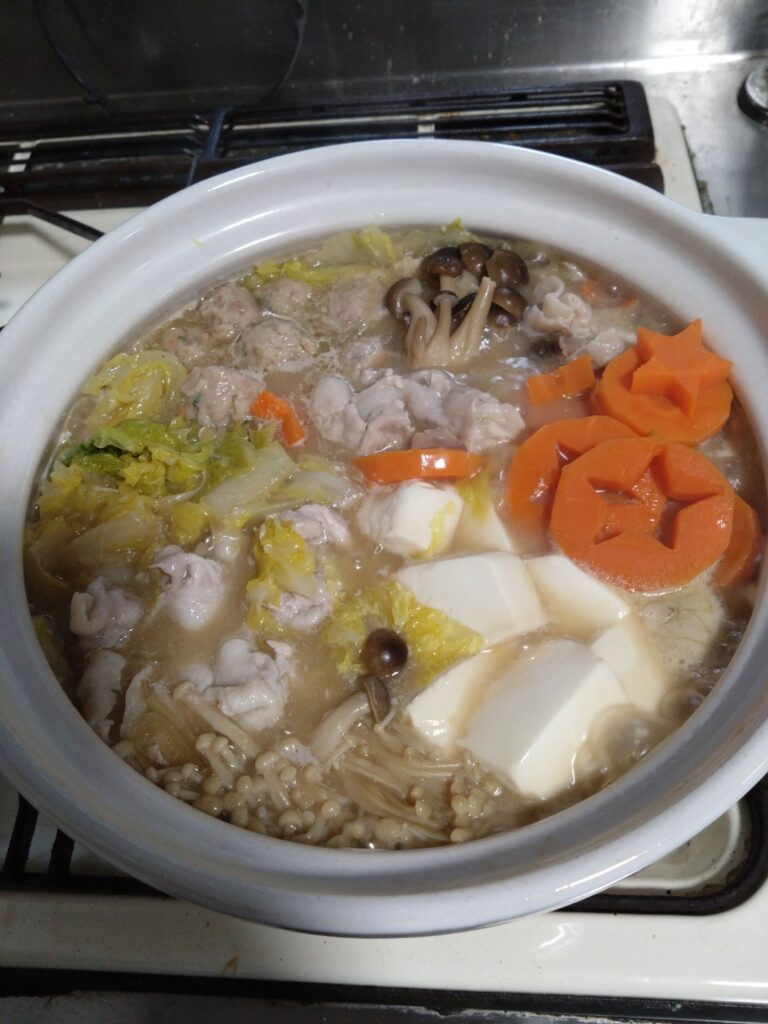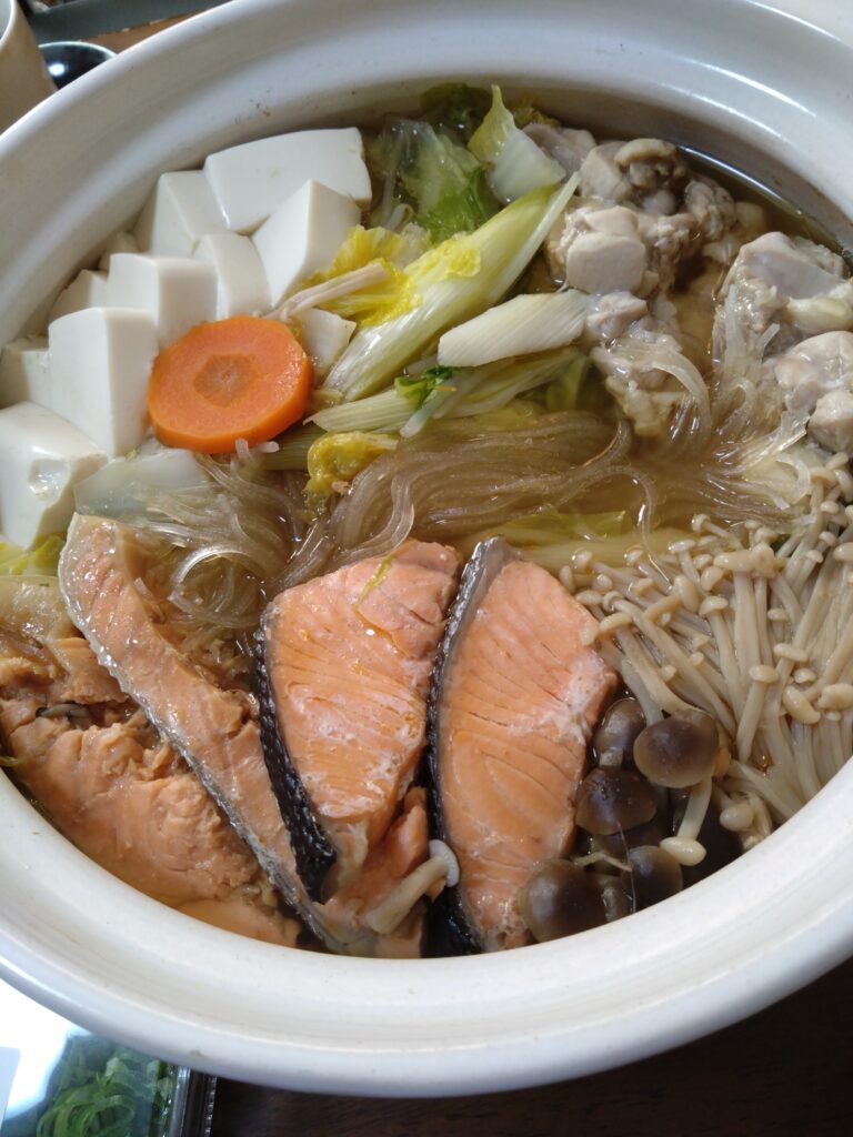お昼はお鍋にしたよ。寄せ鍋。鶏肉と鮭。野菜とキノコたっぷり。人参飾り切り。