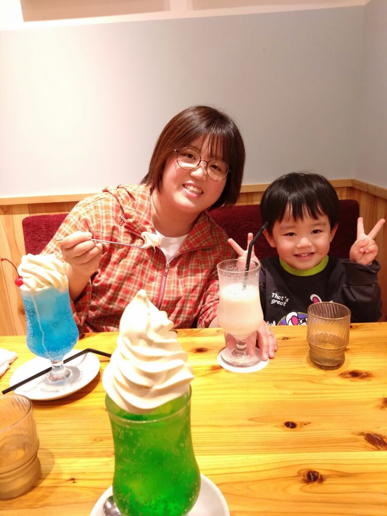 喫茶店で一服。友李くんは、子ども用のジュースでは足りなさそうなので、大人のオレンジジュース🍊笑。ママのメロンソーダ美味そう🤤。パパはアメリカンコーヒー☕
