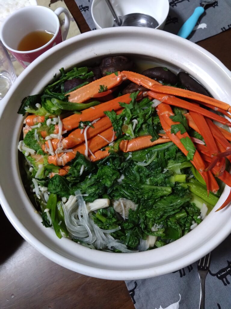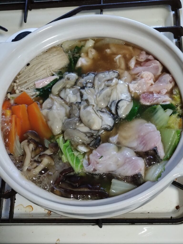12/6(土) お昼ご飯に、牡蠣鍋をしました。貝などの魚介スープで、タラも入れて、鶏のもも肉も入れて、美味しかったです(*´ч`*)