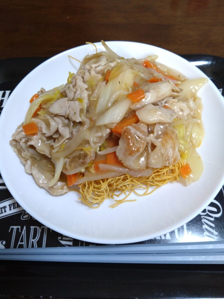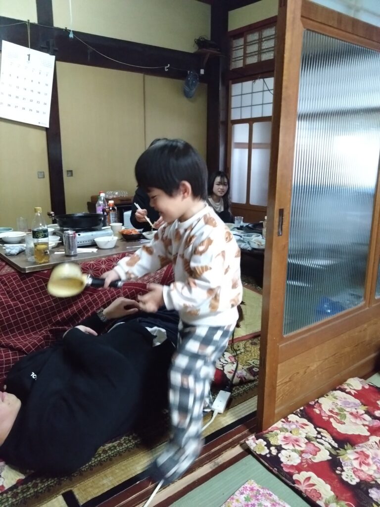 三好ヘルパーさんと料理を頑張ってくれたママ。皿うどんとすき焼き風煮込みを作ってくれました。