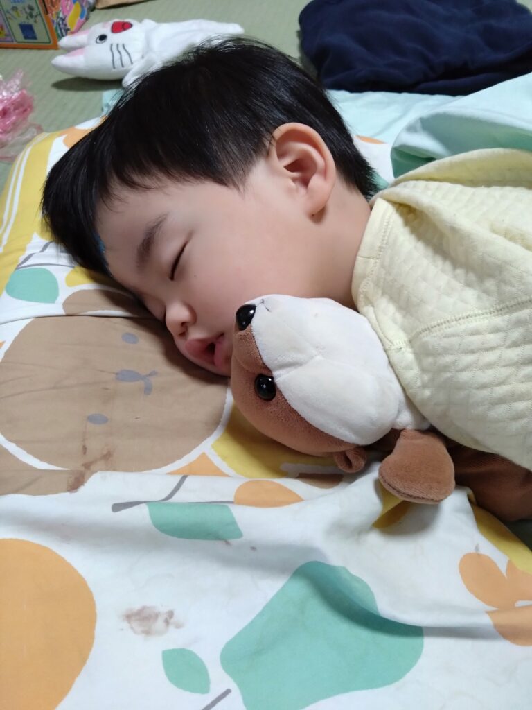12/8(月) 友李くんは園で珍しくお昼寝が出来ずに、先生にトントンしてもらっていたようです。8時半には眠そうにしてました。